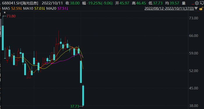 没想到,10月10日,受美国升级出口管制,并把海光信息列入管制清单的消息影响,海光信息20cm跌停,跌幅榜第一;11日,海光信息盘中再度跌停,创下37.73元的新低,离破发仅一步之遥。总市值仅剩883亿,较两个月的高位已经腰斩。