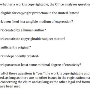 美国版权局于2021年1月颁布了一份名为《Copyrightable Authorship: What Can Be Registered?》的指导性文件,在文件中,他们对一份作品是否有版权做了如下规定:
