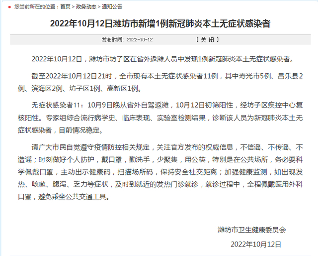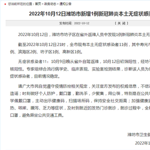 2022年10月12日,潍坊市坊子区在省外返潍人员中发现1例新冠肺炎本土无症状感染者。