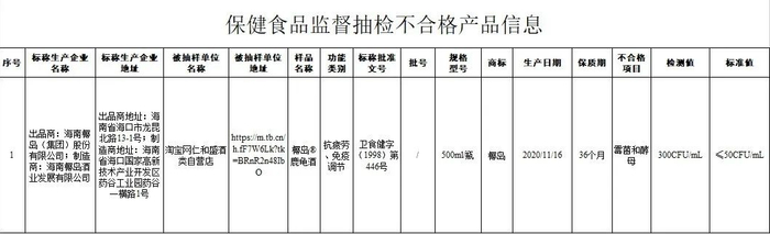 9月29日,国家市场监管总局官网公布的《关于12批次食品抽检不合格情况的通告(2022年第22号)》中,淘宝网仁和盛酒类自营店(经营者为江西省萍乡市安源区金字塔贸易商行)网上销售的,标称海南椰岛(集团)股份有限公司出品、海南椰岛酒业发展有限公司生产的椰岛鹿龟酒(500mL/瓶,2020/11/16),霉菌和酵母数检测值为300CFU/mL。根据《食品安全国家标准保健食品》(GB16740―2014)中规定,保健食品中霉菌和酵母不得超过50CFU/g或50CFU/mL。