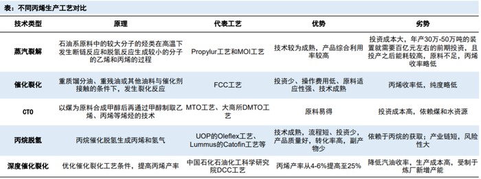 丙烯的主要工业生产方式有四种:传统的石脑油裂解(蒸汽裂解)制丙烯;催化裂化制丙烯(FCC);煤(经甲醇)制烯烃(CTO/MTO);丙烷脱氢制丙烯(PDH)。丙烯不同工艺路径之间优劣势明显,公司所采用的PDH工艺,具有投资少、丙烯收率高、副产物少等特点,但是缺点是产业链较短,需要不断向产业链下游延伸来提升抗风险能力。