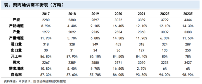 需求方面――聚丙烯下游整体刚性需求较强。根据隆众资讯,薄膜类领域整体保持稳中向好的需求,硬制品(汽车、家电、透明注塑制品、建筑管材、周转箱等)领域受宏观经济影响较大预计表现偏弱;食品及包装膜来看,该领域属于快消品,内需保持平稳运行的势头,外需若22年出口需求有所恢复或带来明显增量;注塑领域,包装容器、透明塑料制品等保持平稳运行的态势。但随着环保政策的日渐完善,国内“限塑令”的稳步推进对聚丙烯下游需求仍会有一定打击,整体看,聚丙烯需求在2022年预期有所好转但仍然呈现偏弱态势。