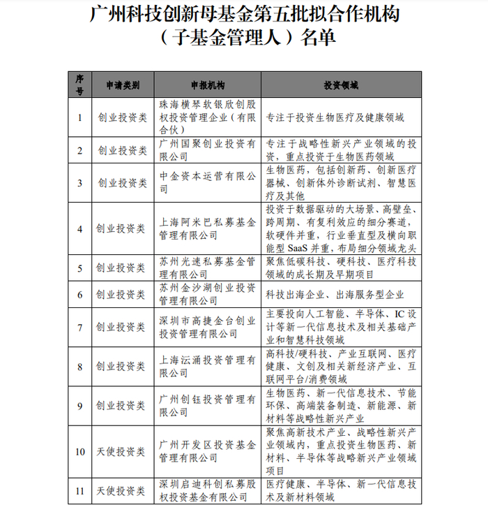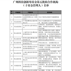 近日,广州市科学技术局发布《广州科技创新母基金第五批拟合作机构(子基金管理人)名单公示》。17家机构被列入子基金管理人,其中,创业投资类机构9家,天使投资类机构8家,此前在4月份已经有10家机构申请广州科创母基金并获得批复。
