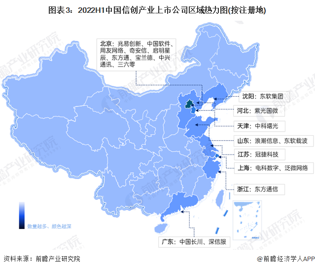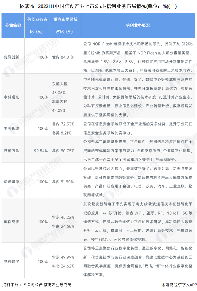 信创产业的上市公司中,几乎所有企业全部收入与信创业务有关。信创产业是提高自主创新的重要路径,国内是主要的业务布局区域。其中中科曙光、东软载波、电科数字、泛微网络、宝兰德、深信服的主战场在华东区域;东方通、启明星辰、奇安信的主要布局区域在华北。