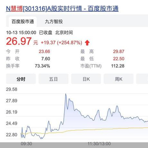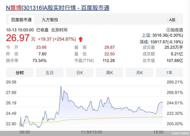 成立于2009年的慧博云通,在10月13日创业板上市首日迎来高光时刻,不光开盘价大涨,盘中股价还一度涨至29.87元,按收盘价26.97元计算,总市值107.88亿元。对于资本市场当天的表现,截至北京商报记者发稿,慧博云通相关人士未予表态。
