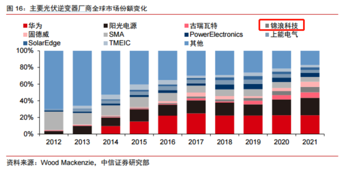 从全球逆变器的竞争格局来看,行业集中度呈显著增加的趋势,根据Wood Mackenzie,CR10市占率由2013年的55%提升至2020年的80%,锦浪科技于当年首次跻身全球逆变器市场份额第6位。
