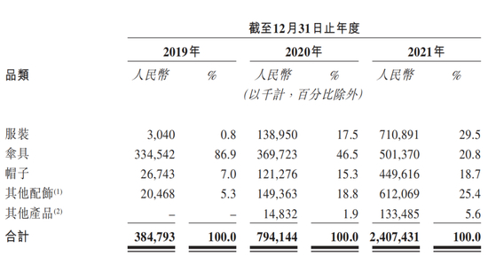 《招股书》显示,蕉下原本主打的防晒伞具品类营收占比一路下滑,从2019年的86.9%降至2021年的20.8%。反而是2019年营收占比仅有0.8%的服装品类,在2021年成了第一支柱品类,营收占比达到29.5%。另外,墨鏡、口罩、披肩、袖套及手套等等配饰系列的营收占比从2019年的5.3%升为2021年的25.4%,成为第二支柱品类。