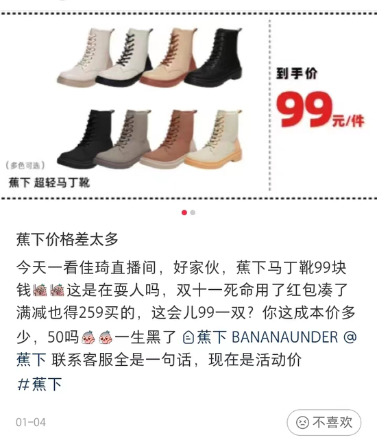 有消费者在社交平台吐槽蕉下营销下的定价问题。“蕉下超轻马丁靴双十一用了红包凑了满减也得259元买的,在李佳琦直播间的最低售价为99元。”价格弹性过大。