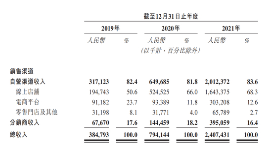 从收入看,线上店铺及电商平台产生的收入由2021年上半年的9.83亿元增加73.8%至2022年上半年的17.08亿元。