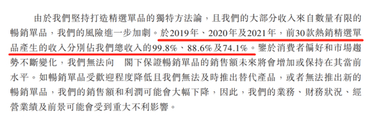 不过,蕉下的产品线虽然丰富,但营收对单一产品的依赖却很强。2019-2021年,其前30款热销精选单品产生的收入分别占其总收入的99.8%、88.6%及74.1%。