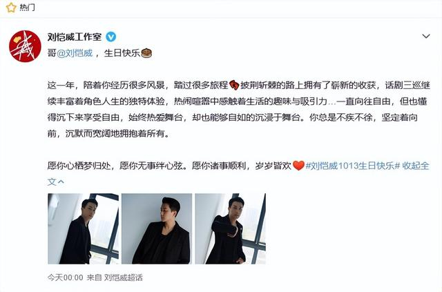 10月13日是刘恺威48岁生日,工作室零点晒照送上生日祝福:愿你心栖梦归处,愿你无事绊心弦。愿你诸事顺利,岁岁皆欢。