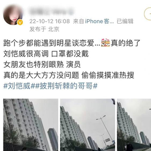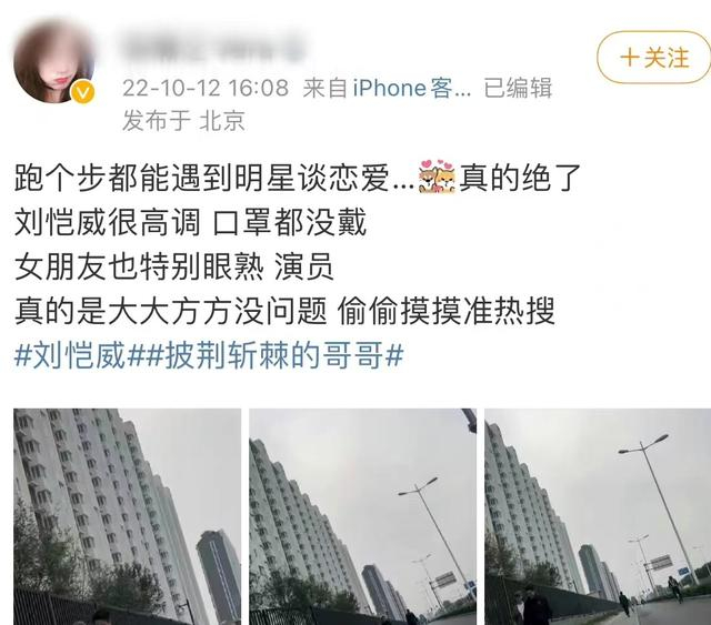10月12日,有网友发文称遇到刘恺威谈恋爱,并晒出他与妙龄女子牵手的图片,称刘恺威很高调,连口罩都没戴,女方也是眼熟的演员。