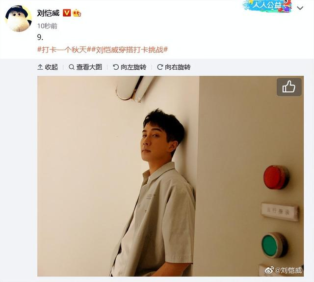 10月13日中午,在网传的“牵手事件”发酵1天后,刘恺威本人发微博晒出穿搭照,带话题#刘恺威穿搭打卡挑战#, 并未回应网上热议的话题。