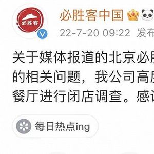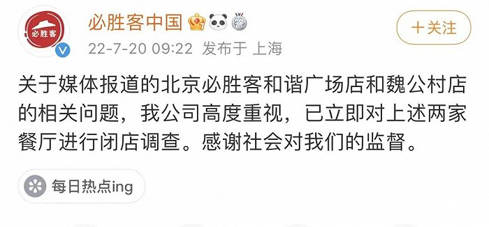 7月20日,针对门店食品安全问题,必胜客通过官方微博发布声明进行回应称,关于媒体报道的北京必胜客和谐广场店和魏公村店的相关问题,公司高度重视,已立即对上述两家餐厅进行闭店调查。