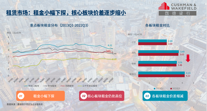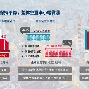从租金表现来看,南京写字楼业主在租金和免租期等条件上进一步让步,整体租金成交净价持续下降。2022年三季度南京甲级写字楼的平均租金小幅下探至2.77元/㎡/天,虽然租金持续承压,但仍保持在2.7元的水平线之上;此外,空置率呈缓慢下降趋势,新街口板块因代表性项目的入驻率提高,空置率降至22%,河西板块则受新项目入市影响,空置率升至28%,整体上看,南京写字楼市场仍具有一定的发展韧性。