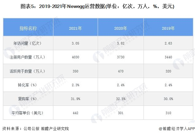 截至2021年底,Newegg注册用户有4030万人,年访问量达到3.05亿次;活跃用户有350万人;平均客单价442美元。Newegg网站的运营数据如下: