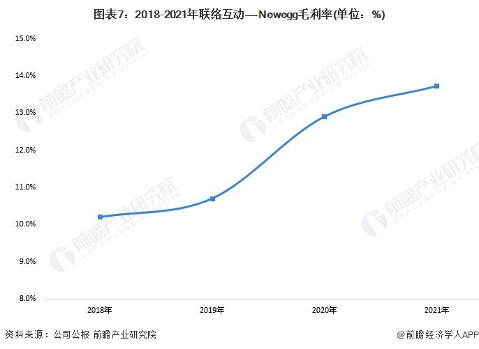2018-2021年Newegg毛利率逐年上升,从2018年的10.2%上升至2021年的13.7%。