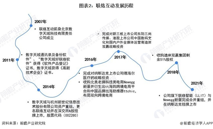 2007年,联络互动前身北京数字天域科技有限责任公司成立。2014年,数字天域与杭州新世纪信息技术股份有限公司资产重组,申请获证监会批准,公司更名联络互动并在深交所A股挂牌上市,股票代码(002280)。2021年联络互动(002280)旗下联络智能(LLIT)与Newegg新蛋完成合并重组,并在纳斯达克挂牌上市(公司交易代码为NEGG)