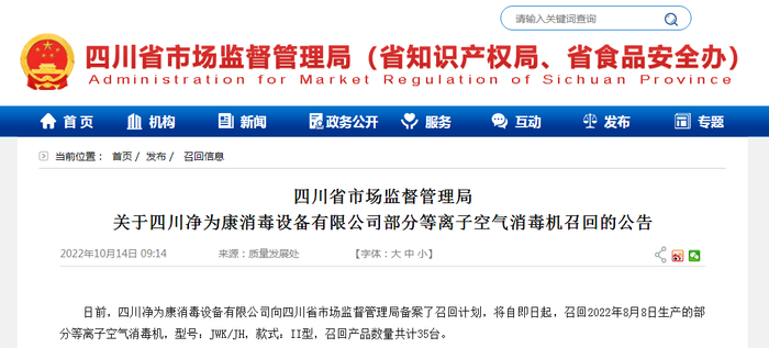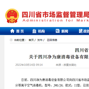 中国质量新闻网讯 据四川省市场监管局网站10月14日消息,日前,四川净为康消毒设备有限公司向四川省市场监督管理局备案了召回计划,将自即日起,召回2022年8月8日生产的部分等离子空气消毒机,型号:JWK/JH,款式:II型,召回产品数量共计35台。