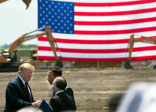 ▲当地时间2018年6月28日,美国威斯康星州,时任美国总统特朗普与鸿海董事长郭台铭共同出席富士康在美国新工厂的动工仪式,并发表讲话。图/IC photo
