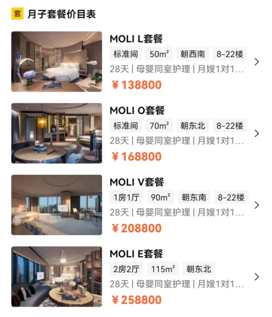 截至目前,该品牌已在北京开出三家月子中心,其产品售价不菲。以朝阳区某门店为例,其最便宜的月子套餐售价为13.88万元,护理时间为28天,而其最贵的一款月子套餐价格达25.88万元。