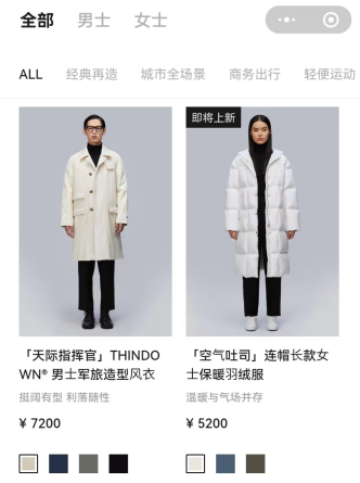 目前,SKYPEOPLE已经上线官方小程序,共上架了24款产品,主要类型为羽绒服。其产品售价普遍超过3000元,最贵的一款男士风衣价格高达7200元。