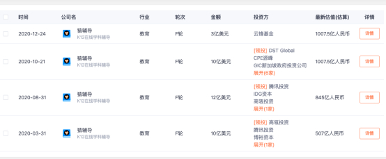 IT桔子信息显示,2020年,猿辅导共获得4轮融资。累计金额超过35亿美元,其中有25亿美元发生在2020年下半年。