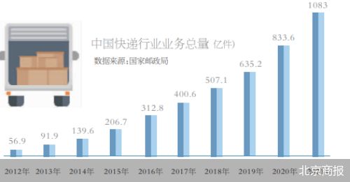 用“一日千里”形容中国快递近十年的发展也不为过。2012-2021年,中国快递业务量从57亿件攀升至1083亿件,增加了18倍。
