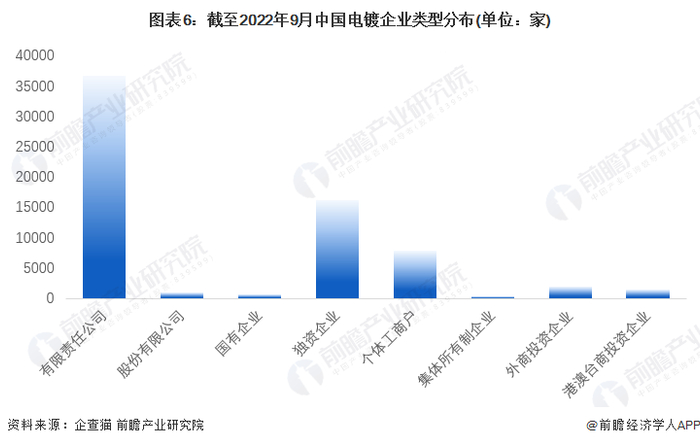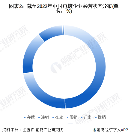 全文统计口径说明:1)上述数据均来源于中国企业数据库(企查猫),存在一定的统计误差。2)搜索相关关键词为“电镀”;3)企业筛选逻辑为:企业的名称、产品服务和经营范围中包含了“电镀”的企业。4)统计时间截至2022年9月19日。5)由于电镀行业企业数量庞大,企业统计的经营状况中为存续和在业;6)若有特殊统计口径会在图表下方备注。