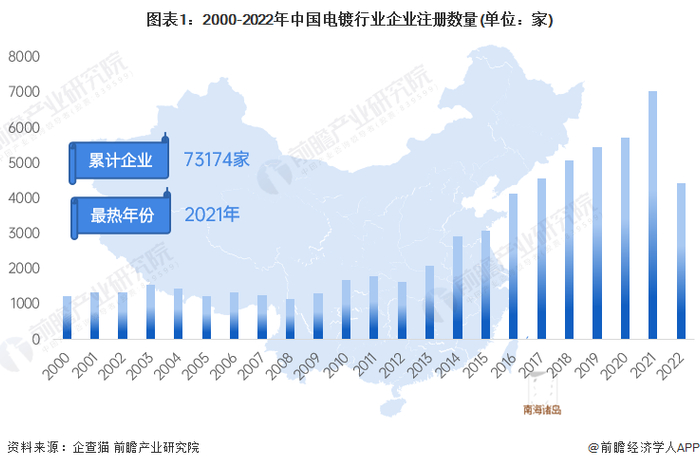 根据中国企业数据库企查猫,目前中国电镀行业企业共有73174家,其中以2021年为主要注册热潮,2021注册企业数量为7037家。截止统计时间,2022年共注册4421家。