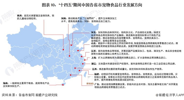 “十四五”期间,我国主要省份也提出了宠物食品行业的发展目标,河北强调推动宠物食品向宠物繁育养、宠物用品、宠物玩具加工、宠物医疗、宠物会展等多业态拓展,上海明确提出扩大宠物食品等消费品进口。其他省市也在宠物食品特色产业建设、宠物食品跨境电商进口等方面做出规划: