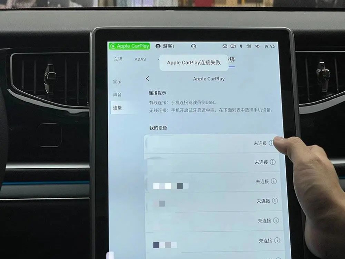 当笔者在北京其中一家自游家门店的展车上测试Carplay投屏时,遇到“Apple CarPlay连接失败”的情况。在两位店员尝试了将近二十分钟之后,仍然无法解决。期间,一位店员还尝试给车辆下电重启。最后,经过一顿“胡乱操作”之后,才成功连接上CarPlay功能。