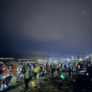 他深夜出门,没带网兜,而是带上了单反和无人机。当天8点,他看到海肠霸屏朋友圈。照片上只能模糊看到漆黑的海滩上,有无数头灯、手电的光芒闪烁,看上去像是一片密密麻麻的萤火虫。