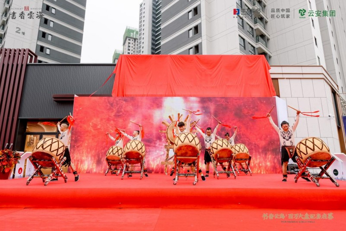 大型原生态歌舞表演《鼓韵山瑶》仿佛将《云南映象》搬到了项目现场,热情活力的舞蹈演员们,以有力的身姿勾勒出壮丽的云南山河,用震撼的鼓声呐喊出盛世的锦绣风采,磅礴的鼓声气势如虹,开场便将气氛点燃。