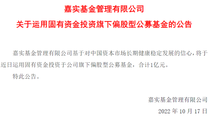 其中,嘉实基金公告显示,基于对中国资本市场长期健康稳定发展的信心,该公司将于近期运用固有资金1亿元,投资于本公司旗下偏股型公募基金。
