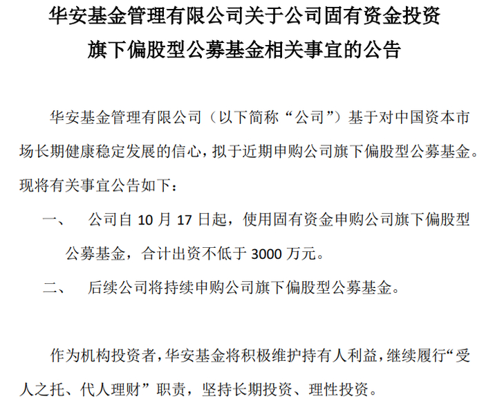 华安基金也基于对中国资本市场长期健康稳定发展的信心,决定自10月17日起使用固有资金申购公司旗下偏股型公募基金,合计出资不低于3000万元。后续,该公司将持续申购旗下偏股型公募基金。