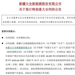 大全能源晚间公告,公司及全资子公司内蒙古大全近日与某客户签订了《硅料采购合同》,合同约定2023年-2027年某客户预计共向大全能源方面采购4.62万吨太阳能级原生多晶硅。按照PVInfoLink最新(2022年10月12日)公布的多晶硅致密料均价30.30万元/吨(含税)测算,预计采购金额约为139.99亿元。
