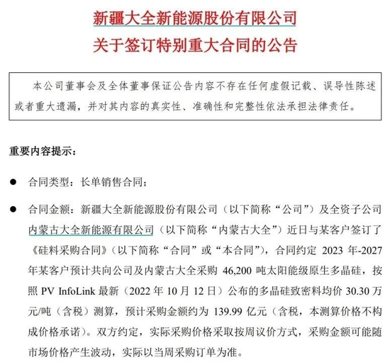 就在5天前,大全能源刚揽获高达470亿元巨额多晶硅供应订单。10月13日,该公司曾披露与双良硅材料(双良节能子公司)签订了《多晶硅采购供应合同》,合同约定2022年至2027年买方预计向卖方采购多晶硅料共15.53万吨。
