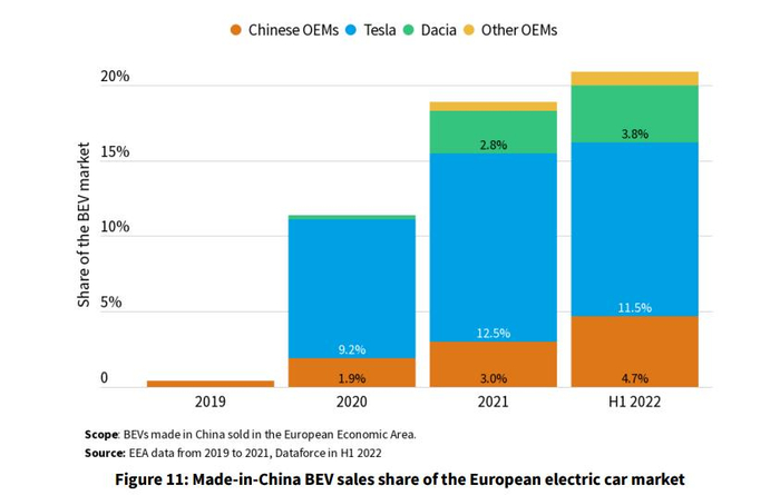 如果将一些在中国生产的非中国品牌电动车计算在内,那么2022年上半年中国生产的电动车占到欧洲电动市场份额的21%。
