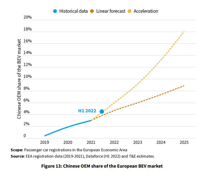 T&E报告指出,今年上半年,中国公司电动汽车占欧盟纯电动汽车销量的5%。而在2019年,这个比例仅为0.4%。其预计,到2025年,中国电动车品牌的市场份额可能会达到18%。