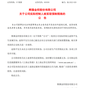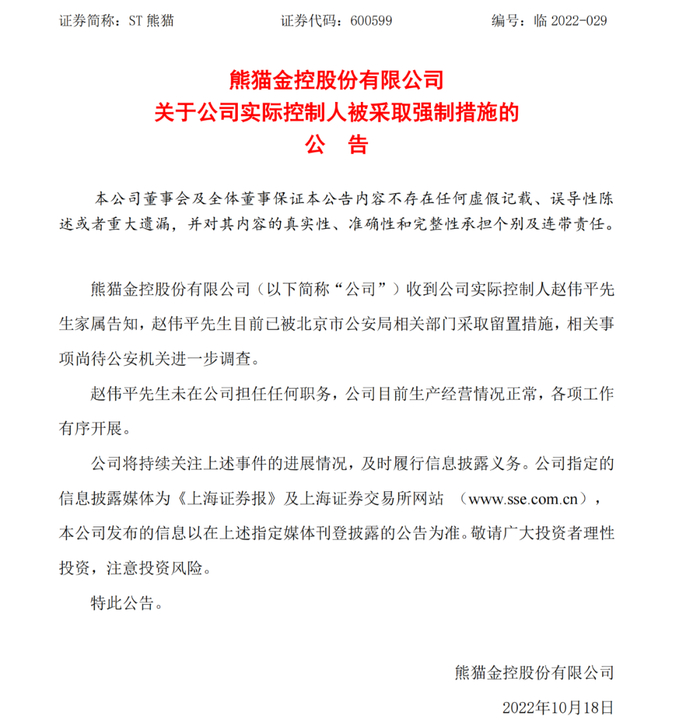 10月17日晚,ST熊猫公告,公司收到实控人赵伟平家属告知,赵伟平目前已被北京市公安局相关部门采取留置措施,相关事项尚待公安机关进一步调查。
