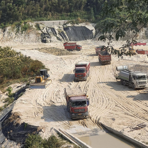 驱车前往矿区的路上,沿途可见裸露的红土及郁郁葱葱的灌木。当道路从水泥路变成了碎石路,车开始颠簸起来,沿途拉矿车却在逐渐增多。体型庞大的拉矿车从山路前方驶来,卷起的尘烟,让两侧的植被蒙上了一层灰白色的尘土。
