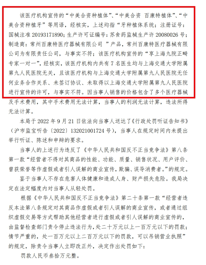 上海美冠口腔门诊部谎称种植牙为中美合资被罚30万