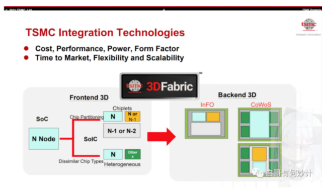 多年之后积累,台积电便推出了如CoWoS、SoIC等多个封装技术平台方案,随后把CoWoS,SoIC的整合到一起,搞了一个新的封装品牌叫“3D Fabric”,但是这更像是直接凑在一起的大礼包,实际案例更多的依然是一对一定制化封装服务,并不是传言中为客户提供“芯片像搭积木一样”高效的封装方案。