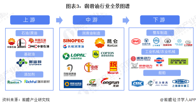 中国润滑油上游产业包括石油开采/炼油、基础油、添加剂,代表企业包括企业有中国石油、中国石化等炼油企业,瑞丰新材、康泰股份等的润滑油添加剂制造企业,此外还有供应含氟润滑油基础油的供应商新宙邦。中游产业企业有龙蟠科技、康普顿、中国石油、中国石化等工业和车用润滑油企业。下游产业企业有汽车制造、工程机械、船舶制造行业的相关企业,如广汽集团、潍柴动力、中国船舶等。