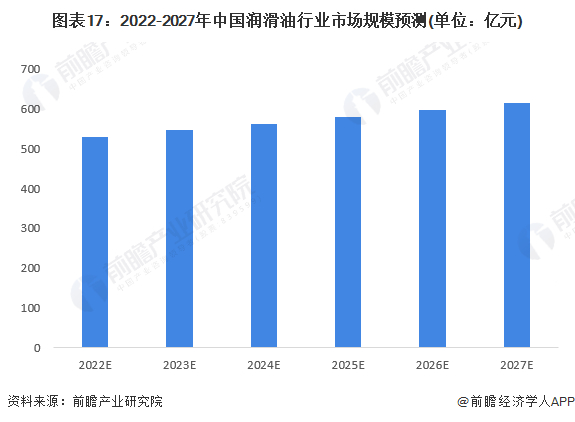 伴随着国家工业化进程不断推进,新能源汽车与工业崛起,润滑油承担着工业行业运行的重要角色,其市场规模必将在未来几年不断提升。根据中国润滑油均价以及未来五年润滑油行业消费量数据测算,至2027年,我国润滑油行业市场规模将达到615亿元。