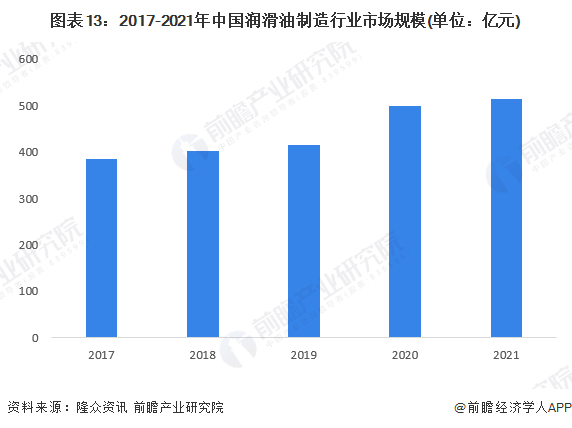 在我国汽车、基建等领域的发展推动下,我国润滑油市场需求保持稳定增长。在车用润滑油需求方面,随着新能源电动车的推广与普及,专用于新能源汽车的润滑油产品将是更有利可图的细分车油市场。在工业润滑油需求方面,随着我国政府对“新基建”领域的投资力度加大,我国工程机械行业的市场需求将快速增长,与此相关的工程机械的润滑油需求也将随着增长。根据我国润滑油市场需求情况,测得2021年中国润滑油行业市场规模约为515亿元。