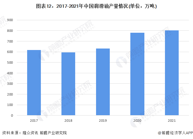 当前,得益于润滑油行业在中国市场内逐渐蓬勃发展,2017-2021年中国润滑油产量整体呈现增长趋势。根据隆众资讯公布的数据, 2021年润滑油产量约超过800万吨。