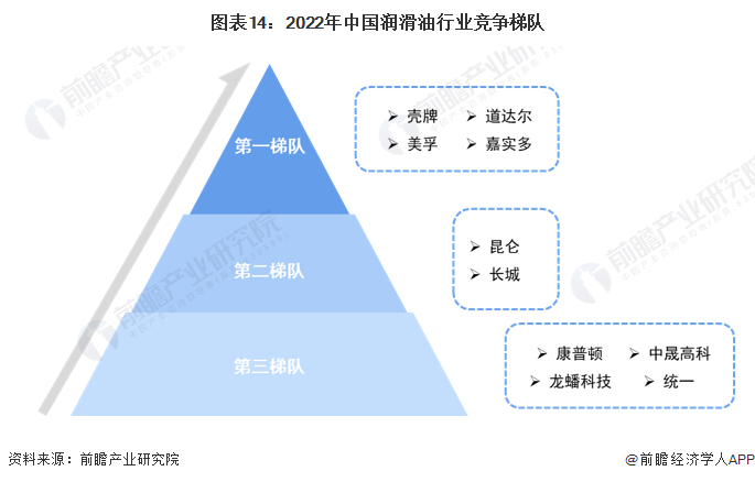 从销售情况来看,中国润滑油行业企业大致分为三个梯队。第一梯队的企业是以壳牌、美孚等为代表的国外润滑油行业领先企业;第二梯队是国内上市的石油企业,中国石油和中国石化,两家公司企业是石油行业最大型的两家公司,拥有多项石油生产链的生产技术,其中公司旗下的润滑油品牌是销量最高的中国润滑油品牌,分别是昆仑润滑油和长城润滑油;第三梯队有康普顿、统一、龙蟠、高科等,这些润滑油品牌所属的企业均属于上市企业。