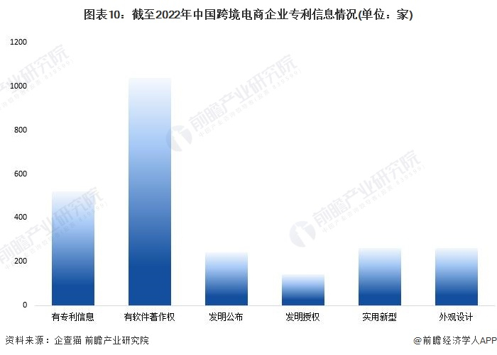 根据中国企业数据库企查猫,目前存续和在业的企业共6134家,其中521家企业有专利信息,1039家企业有软件著作权。在专利信息中,跨境电商企业以外观设计专利为主,拥有实用新型专利的企业有262家。